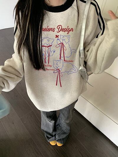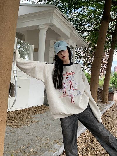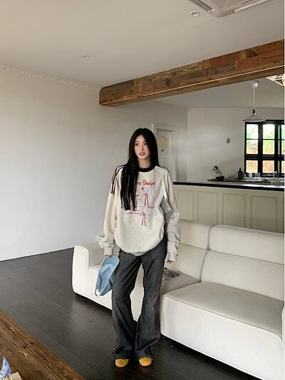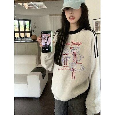 2024 秋冬 トレンド厚手裹起毛 2typeトップス長袖かわいいK-POPTロング_白レディース韓国風ロゴ衣装ルーズゆったりプリントおしゃれサイズスリーブシルエットファッション系サイドシャツフット