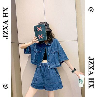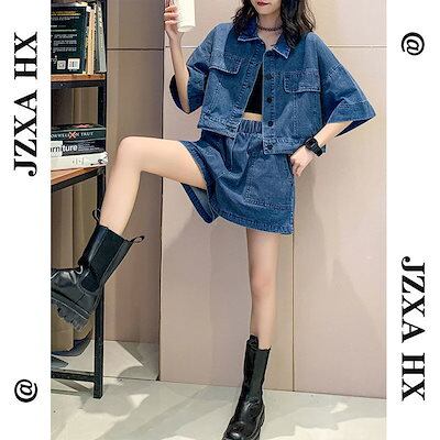 人気夏ファッションスーツ レディース スリム見え ギャル 半袖デニムトップス+ハーフパンツ 2点セット