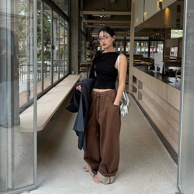 IN.choose u Xiaoxiaojia 2025春韓国版ゆったりスリム伸縮性ウエストドローストリングワイドレッグジーンズレディース