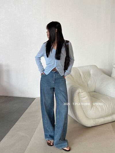 T-PLATFORM レディース ストレートレッグ レトロ ジーンズスリム バナナ パンツ韓国風オールマッチ T008N