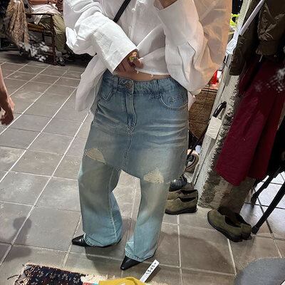 IN.choose u Xiaoxiaojia 2025 春 韓国デザイン ウォッシュド スリム ストレート デニム スカート パンツ レディース