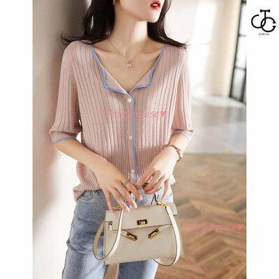 Tシャツ レディース 春夏新作 40代 半袖 ニットトップス 無地Vネック Tシャツ レション ショット丈ニットソー ゆったりカットソー おしゃれ 大人 50代 30代