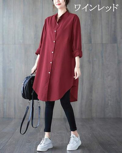シャツ レディース 長袖チュニック ロング トップス 秋 チュニックシャツ バンドカラー 無地 ロングシャツ 立ち襟 ボタン ラウンドヘム 長袖シャツ ひざ丈 前開き シャツワンピース 秋冬 大きいサ